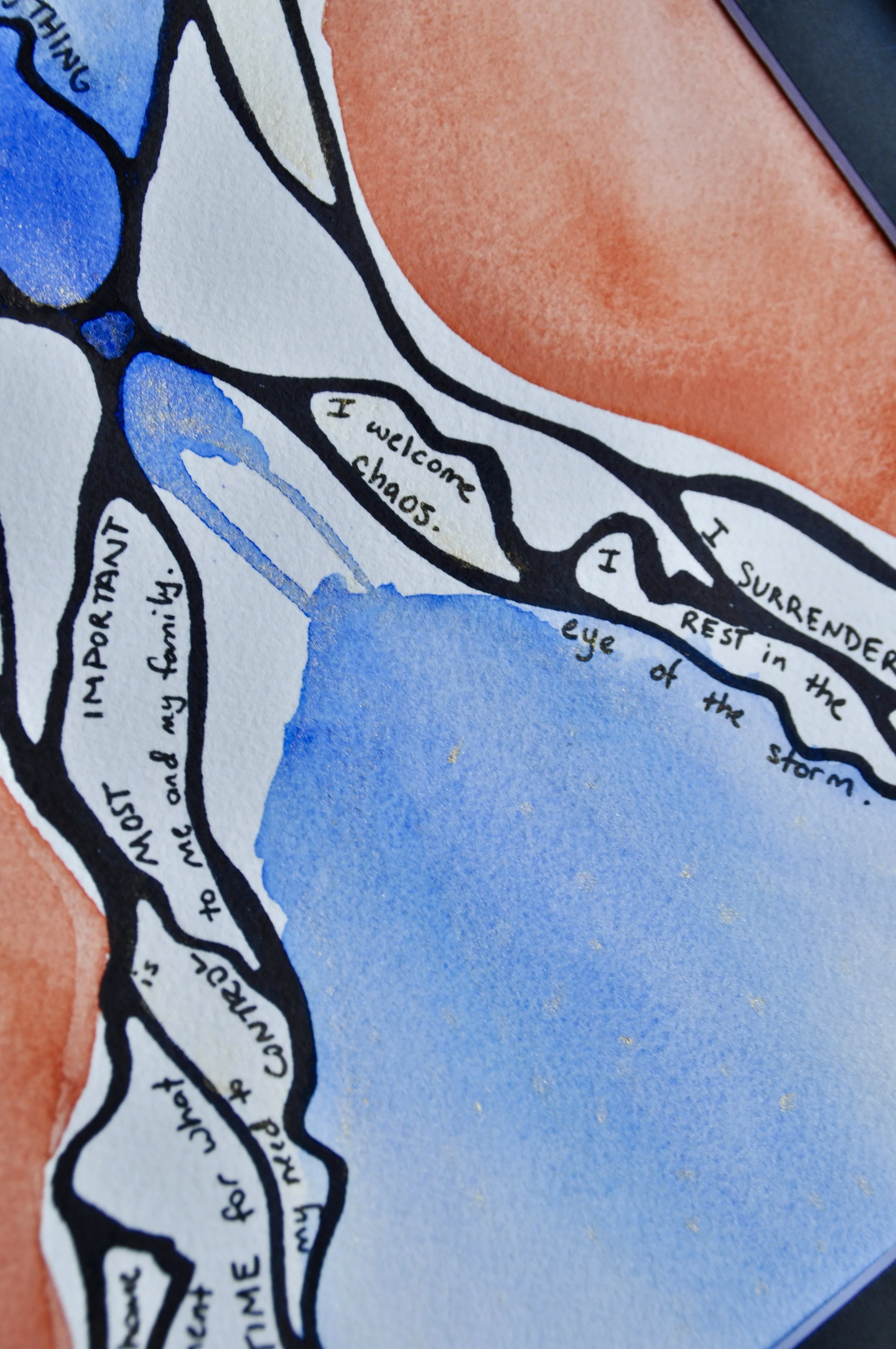 In my first exhibit, “Grief and Other Gifts” - opening at Yakima Healing Arts on March 27th - my work weaves together affirmations, limiting beliefs, color, ink, nature imagery, abstract forms, neurographic lines, and runny paint cascading down the paper like teardrops. Each piece is created through a process of transformation – some more intellectual and some more expressive – that ultimately aims to find hope and resolve within the tumult and heartbreak of these unprecedented times.